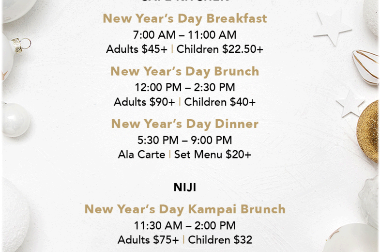 - Price: 🍽️ Café Kitchen Dining Adults | Children New Year's Day Breakfast 7:00 AM – 11:00AM $45+ $22.50+ New Year's Day Brunch 12:00 PM – 2:30 PM $90 + $40+ New Year's Day Dinner 5:30 PM – 9:00 PM Ala Carte | Set Menu $20+ 🍹 Niji Dining (Kampai Brunch & Dinner) Niji is offering a special Kampai (Cheers) experience. Both Brunch and Dinner include free-flowing beverages, such as sparkling wines, domestic and international beers, sake, juices, and more. Adults | Children New Year's Day Kampai Brunch 11:30 AM – 2:00 PM $75 + $32 New Year's Day Kampai Dinner 6:00 PM – 9:00 PM $75 + $32
