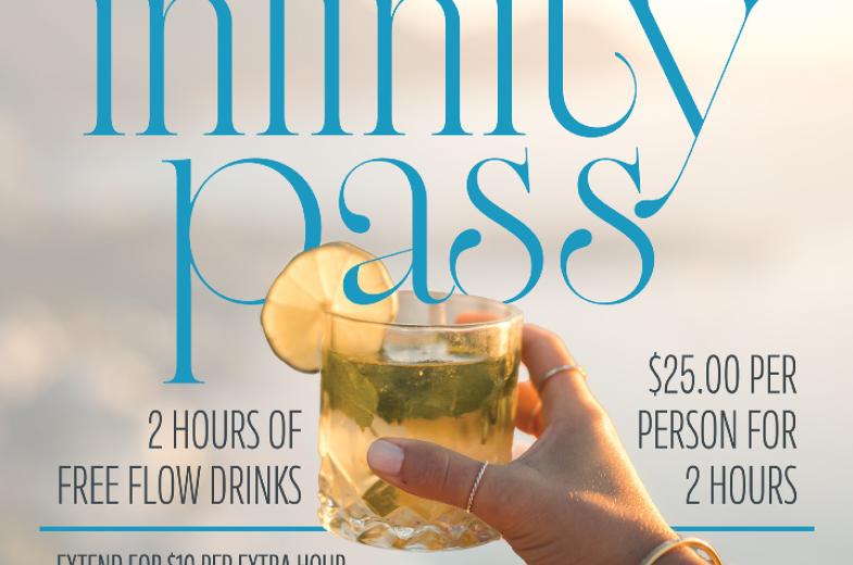 Infinity Pass: Enjoy 2 hours of free-flow domestic canned beers and well drinks for just $25.00 per person (Mon–Thu, 11 AM–10 PM).